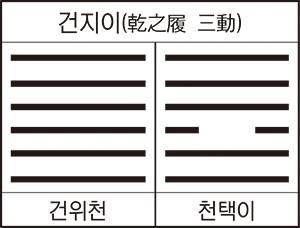 삼효가 변하면 건지이(乾之履)로 천택이(天澤履)괘가 되고 이괘(履卦)는 ‘이호미’(履虎尾)라는 괘로서 무서운 호랑이의 꼬리를 밟는 것처럼 위험이 있는데 군자가 저녁까지도 두려워하고 반성하면 허물이 없으니 모든 일에 최선을 다하고 주의를 하라는 의미이다. ‘건건’(乾乾)은 지극히 애쓰는 모양, ‘척약’(惕若)은 두려워하고 신중함, ‘려’(厲)는 뼈를 깎는 아픔, 제살 깎는 고통의 의미이다.