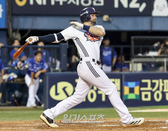 두산 케이브가 5회 1타점 2루타를 날리고 있다.