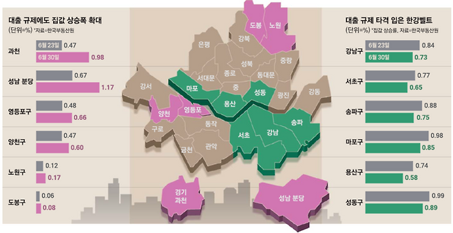 애초 주담대를 6억원 이하로 받는 단지가 많아 이번 규제에 따른 타격이 작은 서울 외곽 지역 가운데 일주일 사이 상승폭을 키운 곳도 있었다. 노원구(0.12%→0.17%), 도봉구(0.06%→0.08%), 금천구(0.06%→0.08%)가 대표적이다. 주담대 6억원 제한에 따른 풍선효과일지 추이를 지켜봐야 할 대목이다. 다음주 발표될 7월 첫째주 주간 시세 조사에는 대출 규제 여파가 더욱 본격적으로 반영될 것으로 전망된다.