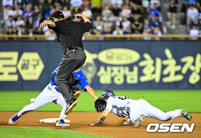 6회말 1사 1루에서 두산 조수행이 삼성 양도근에 앞서 2루 도루에 성공하고 있다. 2025.07.03 /jpnews@osen.co.kr