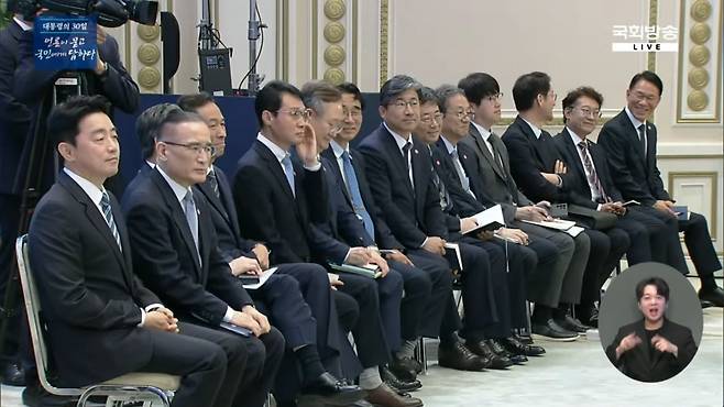 이같은 이 대통령의 발언 직후 생중계 카메라는 참모진을 비췄습니다.