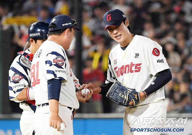 3일 부산 사직구장에서 열린 롯데 자이언츠와 LG 트윈스의 경기. 7회초 2사 1루 LG 함창건에게 안타를 내준 롯데 선발 이민석이 마운드에서 내려오고 있다. 부산=박재만 기자 pjm@sportschosun.com/2025.07.03/