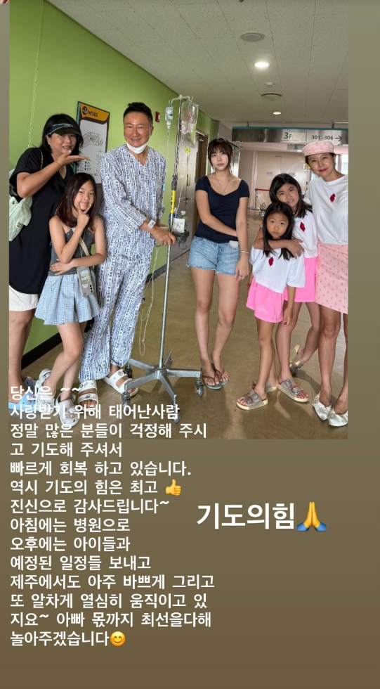 다음 컷에서는 가족 전원이 병원 복도를 함께 걷는 장면이 담겼다. 수액봉을 든 주영훈을 중심으로 아이들과 아내가 둘러싼 모습은 단란함 그 자체였다. 표정은 각기 달랐지만, 병원이라는 공간에서 만들어낸 가족의 장면은 오히려 진한 울림을 안겼다. “기도의 힘, 정말 감사합니다. 놀랄 만큼 빠르게 회복하고 있습니다”라는 이윤미의 문구 역시 감동을 더했다.