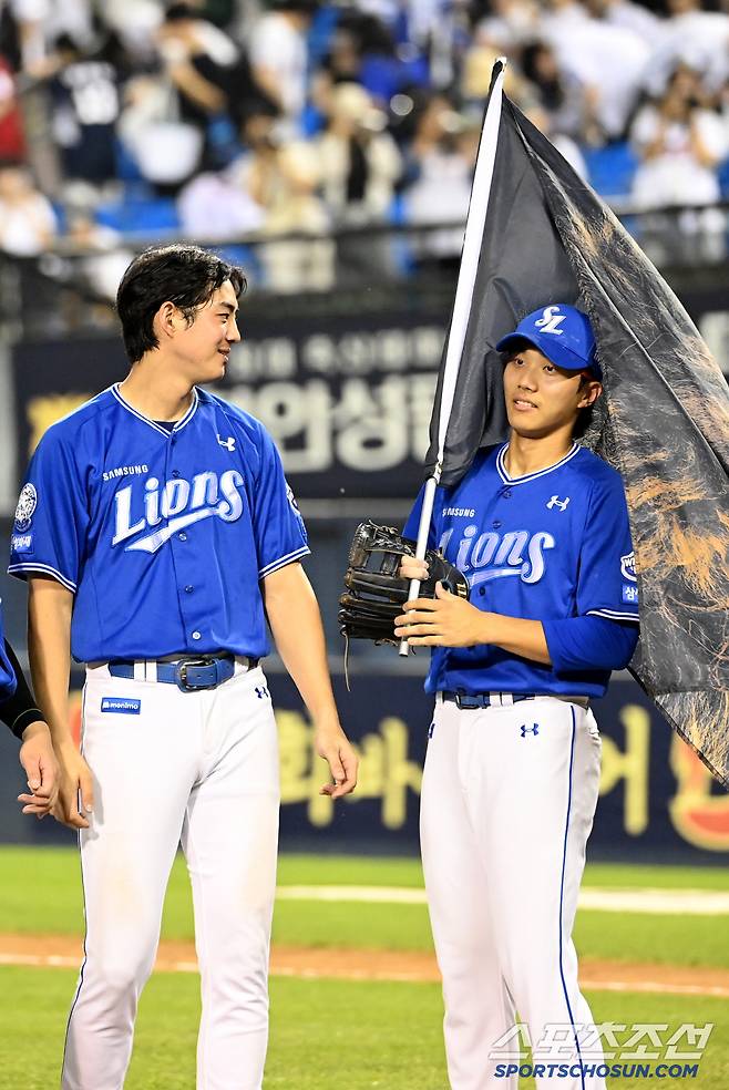 3일 잠실야구장에서 열린 삼성과 두산의 경기, 삼성이 9회 터진 이재현의 역전 만루홈런으로 6대4로 승리했다. 경기 종료 후 캡틴 구자욱에게 사자깃발을 건네받는 이재현의 모습. 잠실=허상욱 기자wook@sportschosun.com/2025.07.03/