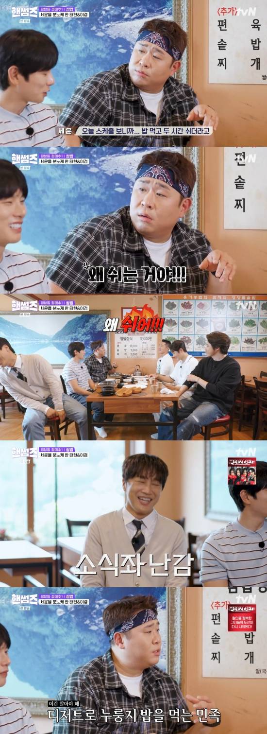 특히 문세윤은 식사를 하던 중 "자 이제 누룽지. 누룽지 먹었어?"라며 당황했고, 이이경은 "저희 (식사) 다 끝났다"라며 눈치를 살폈다. 차태현은 "들키기 전에 다 먹었다"라며 덧붙였다.