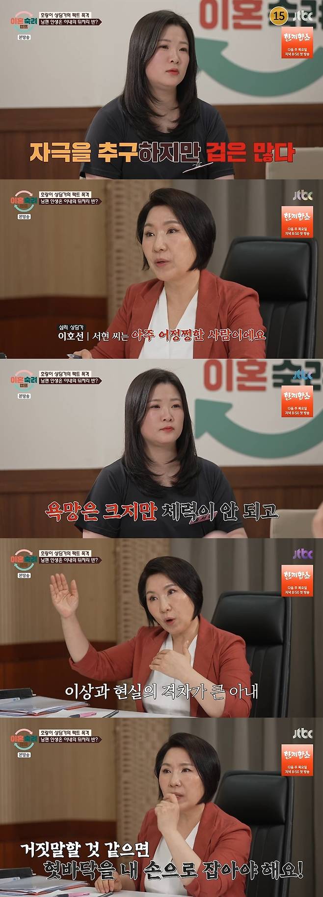 3일 방송된 JTBC '이혼숙려캠프'에서는 이호선 교수가 '팔랑귀 부부'와 상담을 진행했다.