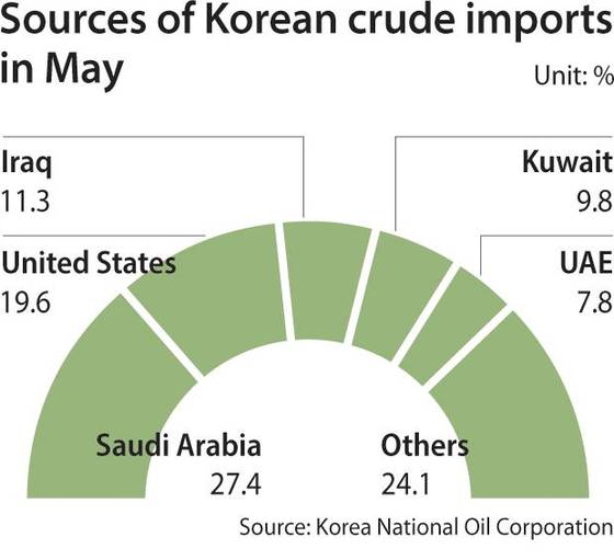 It still accounts for only a small fraction of Korea’s overall imports, making up just 0.6 percent of the country’s total crude intake of 95.54 million barrels in May. Saudi Arabia was the largest supplier at 27.4 percent, followed by the United States at 19.6 percent.