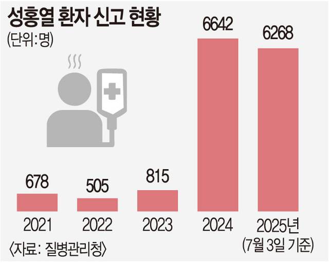 질병관리청은 3일 기준으로 성홍열 감염자가 6268명으로 집계됐다고 밝혔다. 지난 한 해 전체인 6642명에 육박하는 인원이다. 성홍열 환자는 올해 들어 1월 595명, 2월 519명, 3월 687명, 4월 978명, 5월 1457명, 6월 1984명으로 꾸준히 늘고 있다. 6월의 경우 지난해(979명)보다 2배 이상 많았다.