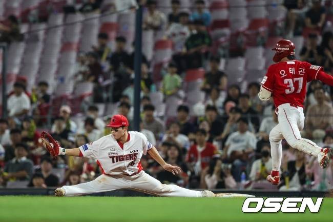순간 KIA 1루수 오선우의 수비동작이 눈부셨다. 학다리를 쫙 벌리면서 팔까지 쭉 뻗었다. 그 까다로운 빠른 바운드 볼이 글러브에 쏘옥 들어갔다. 간발의 차였다. 1루심은 아웃을 선언했다. SSG가 비디오판독을 요청했으나 원심을 바뀌지 않았다. 박찬호와 오선우는 서로를 칭찬하는 손짓으로 자축했다.