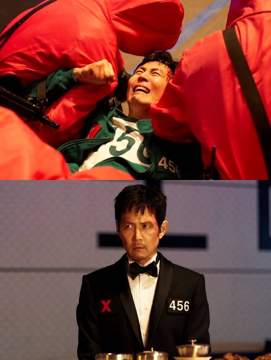 이정재는 3년 전 게임에서 456억을 받은 뒤 딸을 만나러 미국에 가려던 중 프론트맨의 목소리를 듣고 복수를 다짐한 '456번 참가자' 성기훈 역을 맡았다. 죽음의 게임을 끝내기 위해 다시 '456번'이 됐지만 자신이 주도한 반란의 실패로 가장 친한 친구 정배(이서환)와 동료 참가자들을 잃은 뒤 망연자실하게 된 인물이다.