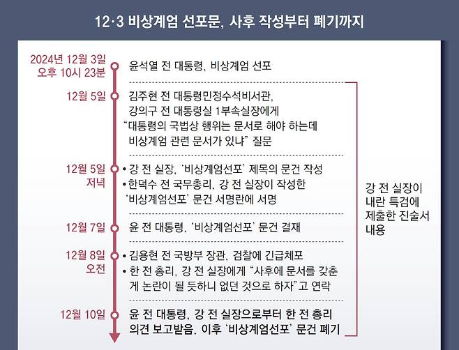 비상계엄 선포 당일(지난해 12월 3일) 국무위원들에게 배부된 ‘비상계엄 선포문’에는 국무총리와 국방부 장관 서명이 빠져 있었다. 강 전 실장은 지난해 12월 5일 김주현 전 대통령민정수석비서관으로부터 “대통령의 국법상 행위는 (국무위원 서명이 된) 문서로 해야 하는데 관련 문서가 있느냐”는 질문을 받은 뒤 새롭게 ‘비상계엄 선포문’이라는 제목의 문건을 작성했다고 진술했다. 이후 강 전 실장은 한 전 총리와 김용현 전 국방부 장관으로부터 각각 서명을 받았고, 7일엔 윤 전 대통령의 결재를 받았다고 한 것으로 알려졌다.