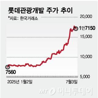 이날 종가 기준 롯데관광개발은 1만7150원으로 지난해 말 대비 124.2% 상승했다. 같은 기간 GKL과 파라다이스는 각각 46.6%, 62.1% 상승하며 두 자릿수 이상의 상승률을 기록했다.