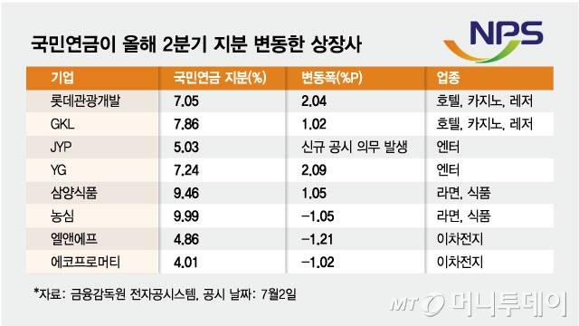 3일 금융투자업계에 따르면 국민연금은 지난 2분기(4~6월) 외국인 대상 카지노 사업을 영위하는 롯데관광개발 주식을 155만주 추가 매입했다고 전날 공시했다. 보유 주식 비율은 기존 5.01% 에서 7.05%로 높아졌다. 국민연금은 또 다른 카지노 관련 종목인 GKL 주식 역시 63만주를 추가로 매입, 지분율을 1.02%포인트 이상 높였다.