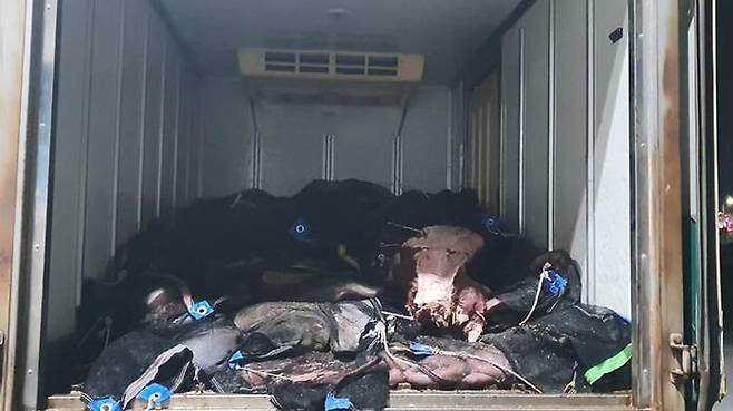 포항해경은 5월 7일 밤 포항 한 항구에서 불법으로 잡은 밍크고래 고기를 싣고 들어오던 선장 등 2명을 현행범으로 체포한 뒤 어선 창고에서 밍크고래 2마리가 담긴 165자루(1.8t)를 압수했습니다.