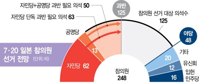 지지율이 저조한 이시바 총리는 여당의 과반 의석 유지를 목표로 내걸었습니다. 선거 대상 지역구와 비례대표를 합쳐 현직 자민당과 공명당 의원은 각각 52명, 14명입니다. 두 정당이 총 50명의 당선인을 내면 참의원에서 남은 의석수 75석을 합쳐 과반을 유지하게 됩니다.