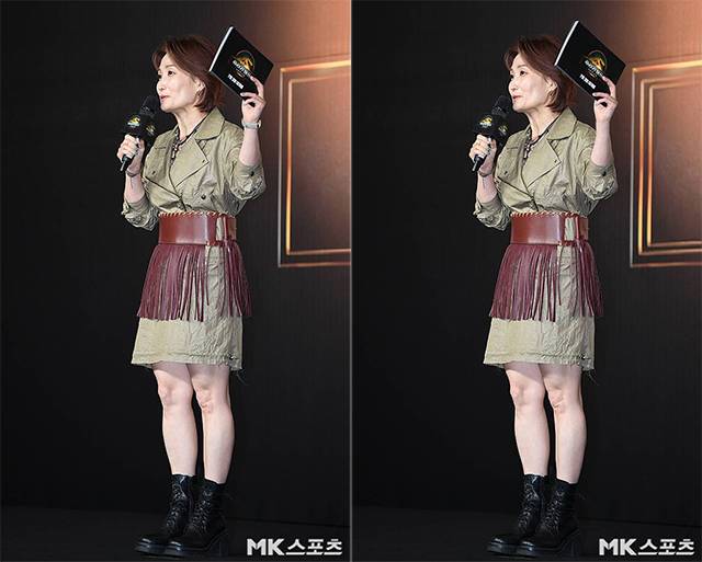 이날 기자간담회에서 박경림은 탐사대 분위기의 카키색 원피스에 버건디 프린지 벨트를 레이어드했고, 블랙 워커로 완벽한 쥬라기 월드 스타일링을 완성했습니다.