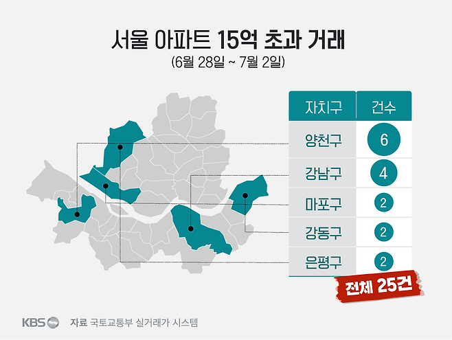 국토교통부 실거래가 공개시스템을 보면 계약일 기준 6월 28일부터 7월 2일까지 체결된 서울 아파트 거래 계약 건수는 모두 177건입니다. 이 가운데 15억 원이 넘는 고가 아파트 계약은 취소된 1건을 빼면 모두 25건입니다.