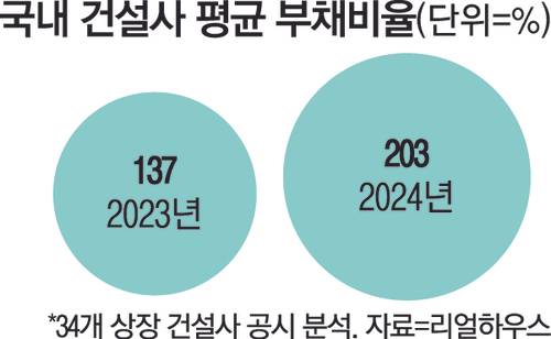 이미 공사비 상승 등으로 인해 국내 건설사들의 재무 건전성은 악화하는 중이다. 분양평가 전문회사 리얼하우스가 삼성물산과 현대건설 등 아파트 브랜드를 가진 34개 상장 건설사의 금융감독원 공시 자료를 분석한 결과에 따르면 지난해 말 기준 평균 부채비율은 203%로 2023년(137%) 대비 66%포인트 상승했다.