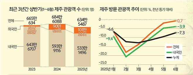 도관광협회에 따르면 올해 상반기(1∼6월) 제주를 찾은 관광객은 634만5487명으로 지난해보다 7.3% 줄었다. 특히 내국인이 533만1496명으로 10.2% 감소했다. 하지만 전체 관광객 월별 증감률을 보면 1∼5월 감소세를 보이다가 6월에 처음으로 0.7% 증가했다. 6월 내국인은 3.9% 줄어 감소폭을 줄였다.