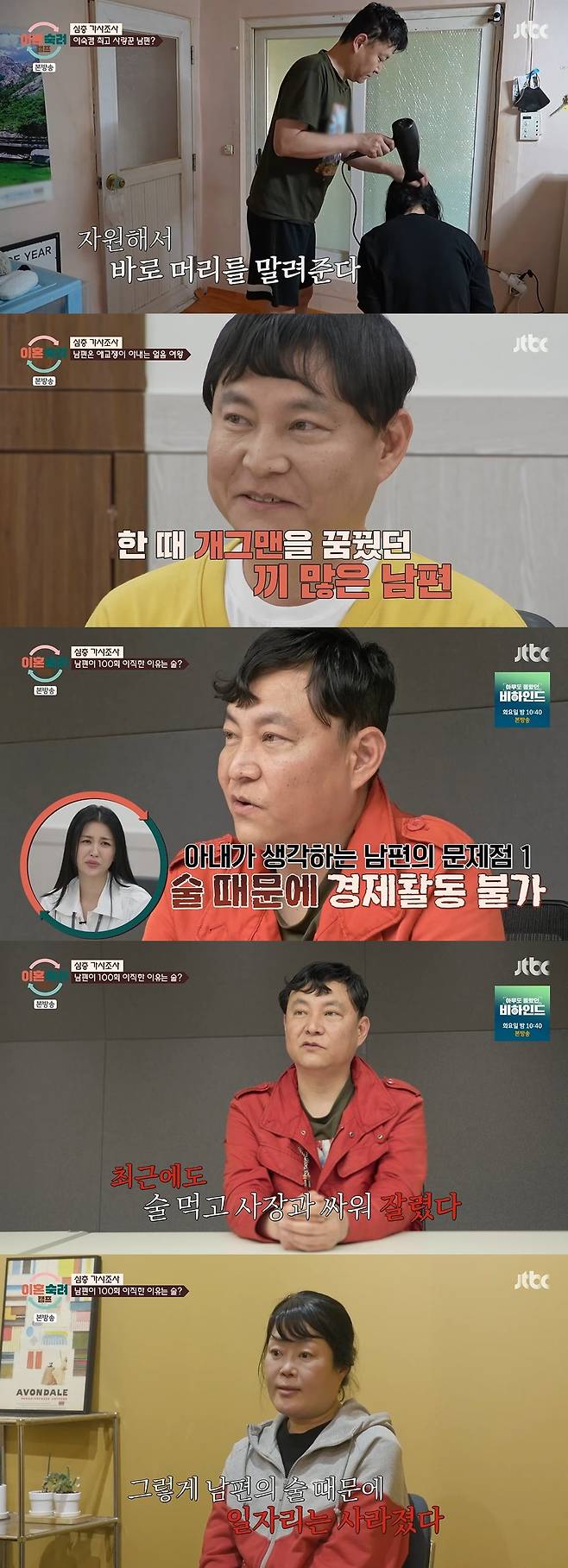 남편은 행사 MC, 공사장, 운전직, 푸드트럭 등 아르바이트를 포함해 옮긴 직장만 100번이라고 전하며, 옮긴 이유가 모두 술 때문이라고 말했다.