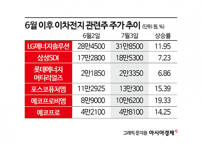 4일 한국거래소에 따르면 LG에너지솔루션은 전날 31만8500원에 거래를 마쳤다. 6월2일 종가 대비 11.95% 상승이다. 같은 기간 삼성SDI는 7.23% 오른 18만5300원을 기록했다. 에코프로비엠과 에코프로도 각각 19.33%, 14.25% 뛰었다.