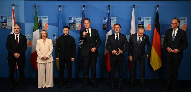 | ▲ 6월 25일(현지시간) 네덜란드 헤이그에서 열린 북대서양조약기구(NATO) 정상회의에서 키어 스타머 영국 총리, 조르지아 멜로니 이탈리아 총리, 볼로디미르 젤렌스키 우크라이나 대통령, 마르크 뤼터 나토 사무총장, 에마뉘엘 마크롱 프랑스 대통령, 도널드 투스크 폴란드 총리, 프리드리히 메르츠 독일 총리가 단체 사진을 촬영하고 있다. |