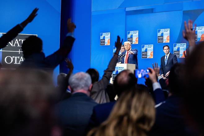 | ▲ 6월 25일(현지시간) 네덜란드 헤이그에서 열린 북대서양조약기구(NATO) 정상회의 후 기자회견에서 도널드 트럼프 미국 대통령이 질문을 받고 있다. |