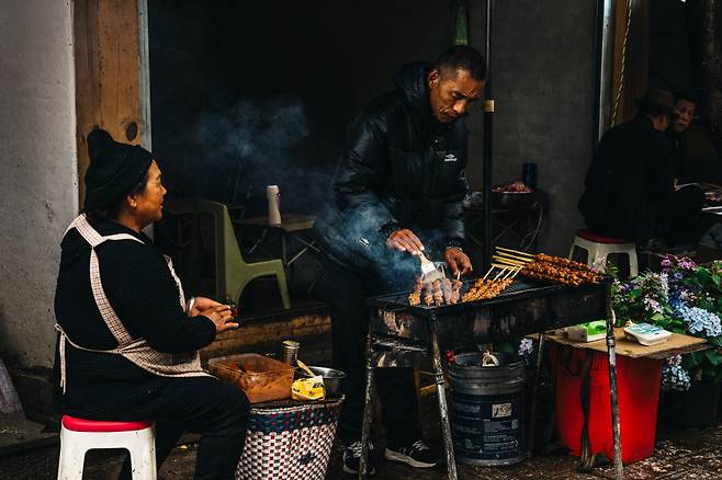충의시장은 새벽 5시부터 저녁 6시까지 운영한다. 참 붐비고, 격양되어 있고, 가끔은 억척스러운 이유로 다툼이 나기도 한다. 시장 분위기는 어디나 다 똑같아서 검은 봉지에 체리 한 움큼 더 가져가려 하는 욕심까지 정겹게 느껴진다. 그래도 다른 게 있다면 이곳이 2,400m 고산지대의 시장이라는 점이다. 이런 말이 있다. 운남에서 움직이는 것은 무엇이든 고기가 되고, 초록색은 무엇이든 채소가 된다. 그만큼 재료 사용이 과감하고 광범위하다. 사방팔방 각기 다른 소수민족 간의 요리법도 천차만별이다.