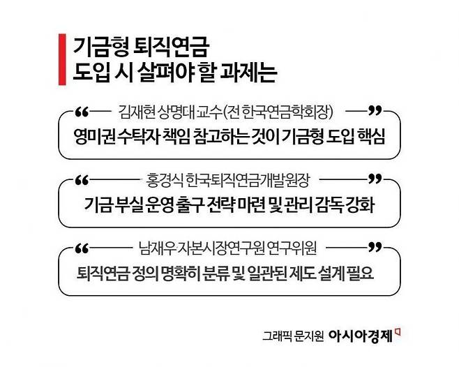 기금형 퇴직연금은 노사와 전문가가 참여하는 기금운용위원회가 기금 운용 방향을 정하고, 이를 수탁 법인이 시행하도록 하는 제도다. 적절한 자산 배분 전략을 세워 손실 위험을 줄이면서도 수익률을 높이는 것이 핵심 과제로 꼽힌다. 다만 투자 문법상 고수익을 바랄수록 손실 위험은 커질 수밖에 없다. 수탁 법인의 도덕적 해이 등으로 부실 운용이 생길 수도 있다. 영미권 유사 제도를 참고해 수탁자 책임과 수급권 보호를 강화해야 한다는 주장이 나오는 배경이다.