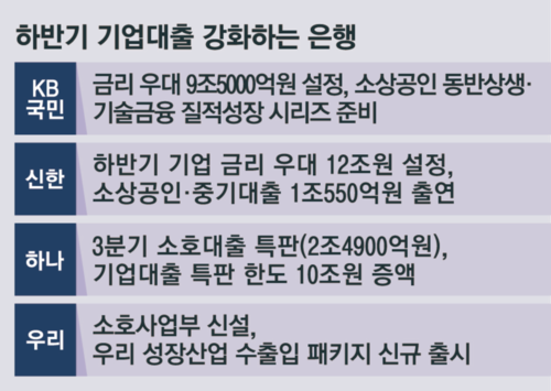 우리은행 역시 하반기에 기업대출 분야를 조금 더 공략한다. 지난달 말 조직 개편을 통해 ‘소호사업부’를 새로 만들어 소상공인과 자영업자를 전담 지원하도록 했고, 최근 ‘우리 성장산업 수출입 패키지’와 ‘원비즈 e-MP’ 등 신상품도 속속 출시했다.