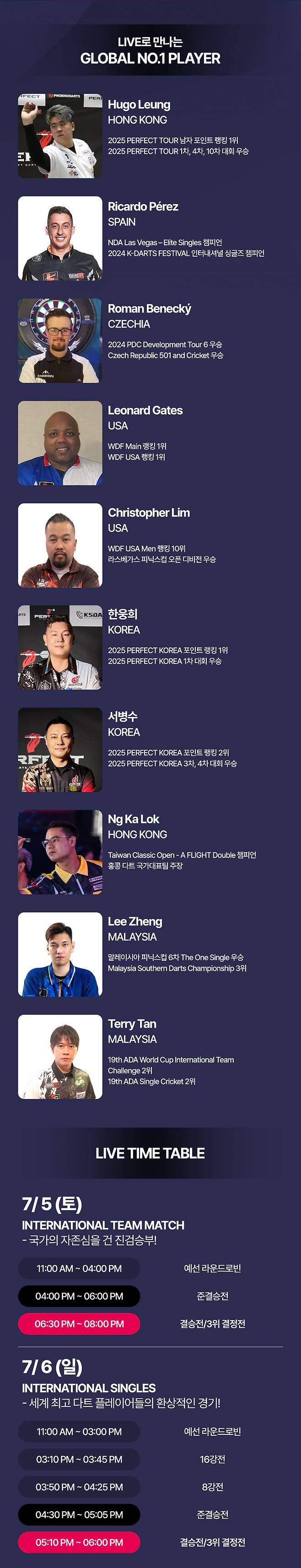 대회 방식은 국가대표들이 참가하는 인터내셔널 싱글즈, 인터내셔널 팀 매치와 일반 선수들이 참가하는 싱글즈, 더블즈, 레이디스 챔피언십 등으로 정통 다트 토너먼트인 제로원 게임과 크리켓 게임으로 나눠 경기가 진행되며 총상금은 1억원이다. 전세계 다트 '신계' 국가대표들이 총출동하는 인터내셔널 싱글즈에선 올 시즌 퍼펙트코리아 1차 대회 우승, 2-3차 대회 준우승에 빛나는 '대한민국 에이스' 한웅희와 'K-다트 인터내셔널 싱글즈 디펜딩챔피언' 리카르도 페레즈(스페인), '2025 퍼펙트 투어 1-4-10차 대회 우승자' 휴고 룽(홍콩), 'WDF(세계다트연맹) 미국 남자 랭킹 1위' 레나드 게이츠 등이 우승을 다툰다.