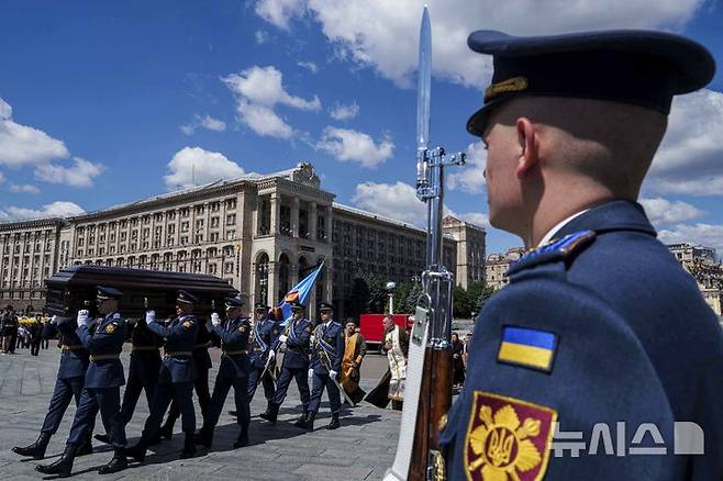 [키이우=AP/뉴시스] 3일(현지 시간) 우크라이나 키이우에서 F-16 조종사 막심 우스티멘코 중령의 영결식이 열려 의장대가 고인의 관을 운구하고 있다. 그는 지난달 29일 러시아의 공습을 방어하던 중 전투기가 손상되자 민가에서 벗어나기 위해 추락 직전까지 전투기 조종간을 놓지 않아 끝내 전사했다. 2025.07.04.