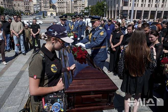 [키이우=AP/뉴시스] 3일(현지 시간) 우크라이나 키이우에서 F-16 조종사 막심 우스티멘코 중령의 영결식이 열려 시민들이 고인과 작별 인사를 하고 있다. 그는 지난달 29일 러시아의 공습을 방어하던 중 전투기가 손상되자 민가에서 벗어나기 위해 추락 직전까지 전투기 조종간을 놓지 않아 끝내 전사했다. 2025.07.04.
