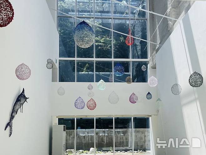 먼저 1층에서는 금기숙 작가의 설치작품 ‘바다의 숨’이 관람객을 맞는다. 어부의 땀과 눈물을 형상화한 물방울 조형물이 전시돼 시선을 끈다.
