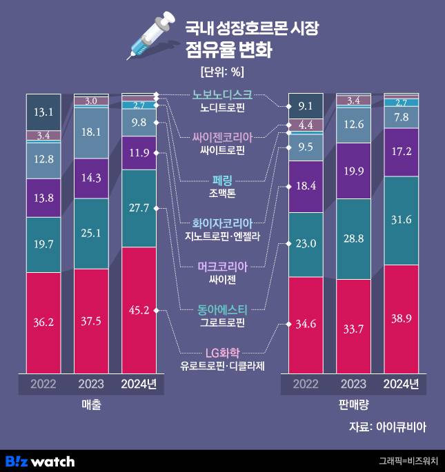 4일 시장조사기관 아이큐비아 자료에 따르면 LG화학, 동아에스티 두 국내 기업이 차지하는 국내 성장호르몬 시장 점유율은 매출, 판매량 기준 모두에서 70%를 넘어선 것으로 나타났다.