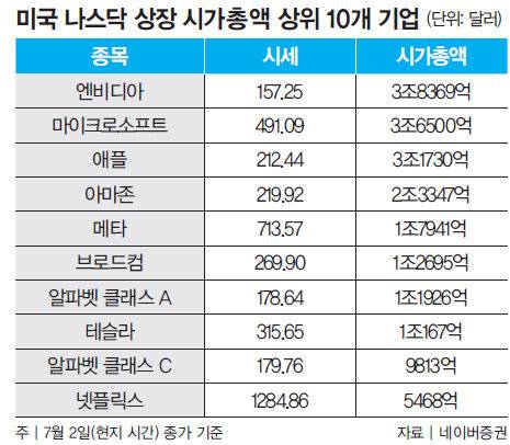 현재 전 세계에서 시총이 3조 달러를 넘어선 기업은 애플과 MS, 엔비디아 단 3곳뿐이다(표 참조). 그중 세 번째로 3조 달러 클럽에 가입한 엔비디아는 2022년 말 챗GPT가 촉발한 초거대 AI 열풍의 최대 수혜주로 떠오르면서 주가가 수직 상승했다. 2023년 6월 종가 기준 시총 1조 달러를 넘어선 것이 시작이었다. 2024년 2월 2조 달러, 그해 6월 3조 달러를 넘어섰고 이제 다시 1년여 만에 첫 4조 달러 진입을 앞두고 있다.