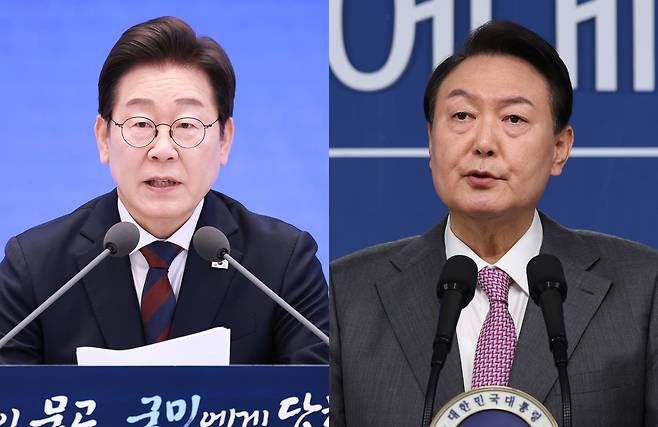 | ▲ (좌측) 이재명 대통령이 3일 청와대 영빈관에서 열린 '대통령의 30일, 언론이 묻고 국민에게 답하다'에서 발언하는 모습. (우측) 전직 대통령 윤석열씨가 지난 2022년 8월 17일 용산 대통령실 청사 브리핑룸에서 취임 100일 기자회견을 하고 있는 모습. |