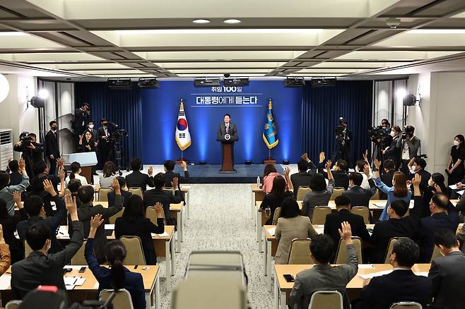 | ▲ 윤석열 대통령이 2022년 8월 17일 용산 대통령실 청사 브리핑룸에서 취임 100일 기자회견을 하고 있다. |