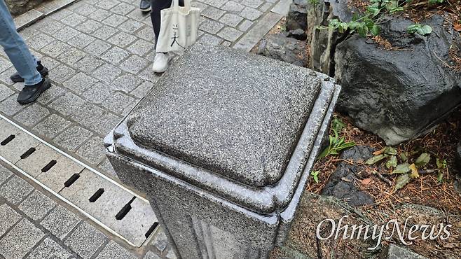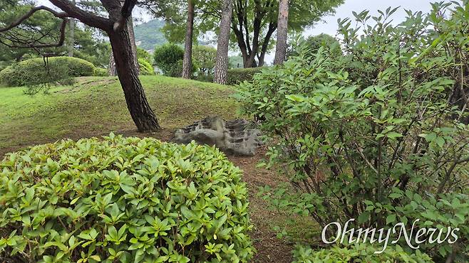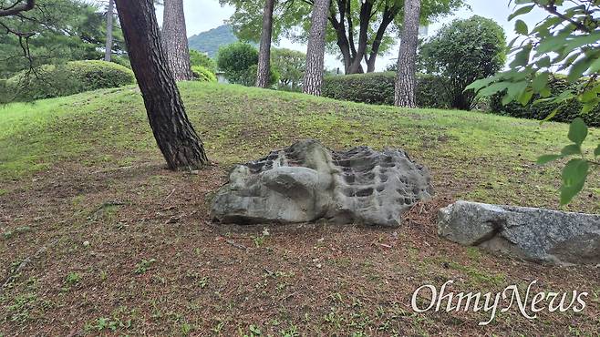 | ▲ 청와대, 천연기념물 반송 아래 일본조경석축 테두리잡기 |