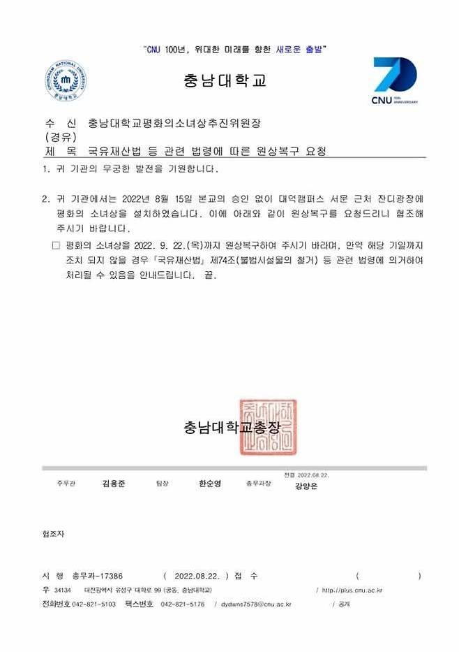 아시아경제가 확보한 충남대학교 공문을 보면, 학교는 지난 2022년 8월 22일 총장 명의로 충남대학교평화의소녀상추진위원장(소추위)에 "본교 승인 없이 대덕캠퍼스 서문 근처 잔디광장에 평화의 소녀상을 설치했다"면서 "2022년 9월 22일까지 원상복구해 주기 바란다"고 했다. 그러면서 "만약 해당 기일까지 조치되지 않을 경우 '국유재산법' 제74조(불법시설물의 철거) 등 관련 법령에 의거해 처리될 수 있다"고 덧붙였다.