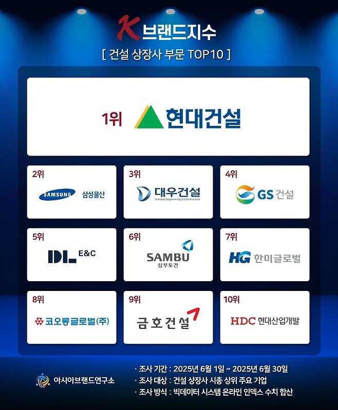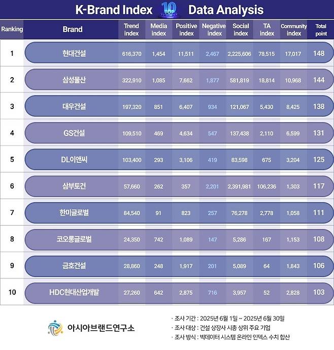 이번 K-브랜드지수 건설 상장사 부문은 건설 상장사 시총 상위 주요 기업을 대상으로, 2025년 6월 1일부터 6월 30일까지의 온라인 빅데이터 792만 3244건을 분석하여 진행됐다.