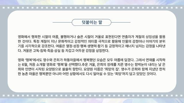 하동마을의 들판과 밭, 작은 집, 시장, 버스정류장까지. 영화는 이 모든 풍경을 그림처럼 따뜻하고 정감있게 담아냈다. 영수와 은희가 처음 만났던 슈퍼, 자장면을 먹으며 데이트했던 시장, 그리고 두 사람이 아기자기한 사랑을 속삭이던 집까지, 모든 공간은 도시의 번잡함과는 대조되는 느리고 반복적인 농촌의 일상을 보여주며 영화의 감수성을 극대화한다.