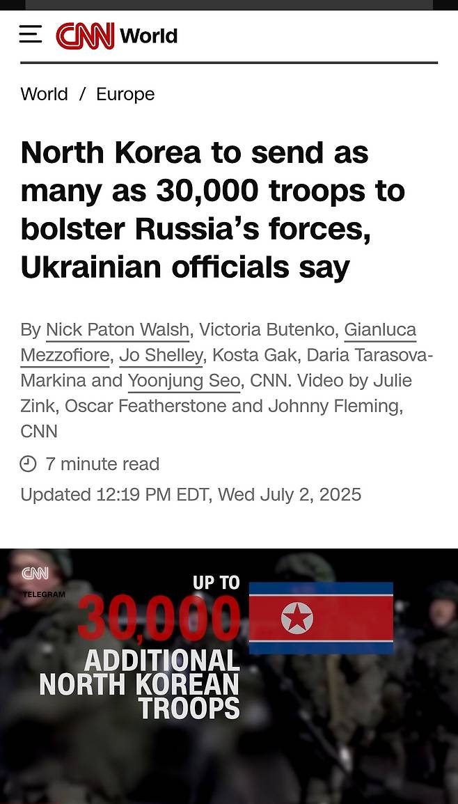 | ▲ 2025년 7월 2일, 미국 CNN은 북한이 최대 3만 명의 병력을 러시아에 추가 파병할 예정이라고 보도했다. |