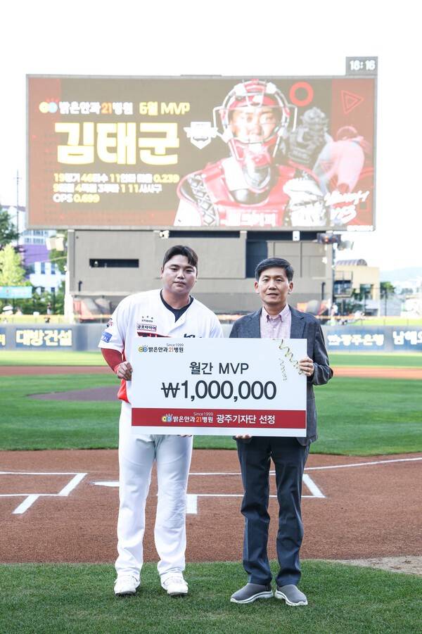 베테랑 포수 김태군은 밝은안과21병원에서 시상하는 6월 월간 MVP에 선정됐다. 시상식은 3일 광주 SSG전에 앞서 열렸다.