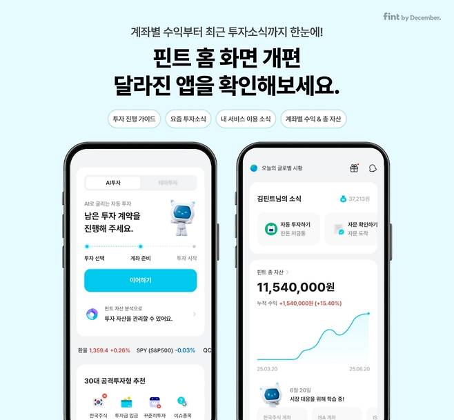 AI 기반 간편투자 서비스 ‘핀트(fint)’를 운영하는 디셈버앤컴퍼니(대표 송인성)는 누구나 쉽게 투자를 시작할 수 있도록 앱의 첫 화면을 전면 개편했다고 4일 밝혔다.