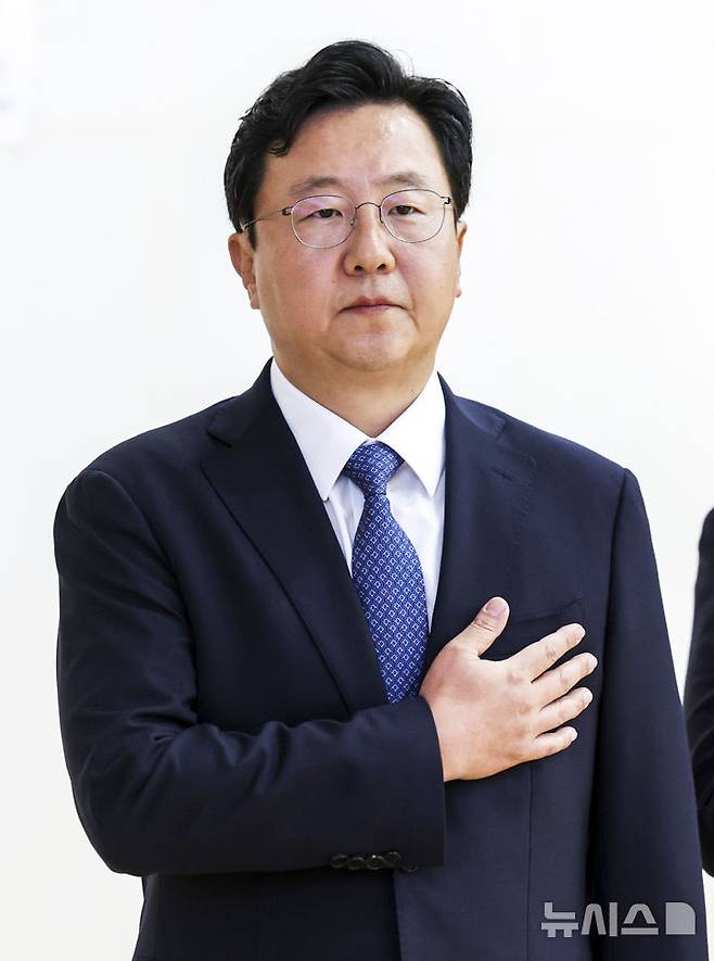 [서울=뉴시스] 김진아 기자 = 정진우 신임 서울중앙지검장이 4일 오전 서울 서초구 서울중앙지방검찰청에서 열린 제65대 정진우 검사장 취임식에서 국민의례를 하고 있다. 2025.07.04. bluesoda@newsis.com