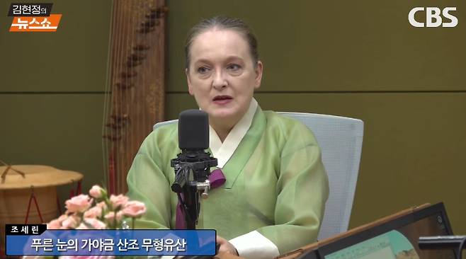 ◇ 김현정> 화제의 인터뷰 시간입니다. 전북 무형유산 40호가 가야금 산조입니다. 이 소중한 유산을 지키기 위해서 전수자, 이수자, 보유자 그리고 인간 문화재를 지정하는데요. 여기에 드는 일이 여간 어려운 일이 아니랍니다. 그런데 지난 봄, 우리나라 최초의 푸른 눈을 가진 외국인 이수자가 탄생했습니다. 미국 알래스카 출신의 조세린 교수. 돌아오는 가을에 가야금 기인 산조 음반 발표를 앞두고 계세요. 오늘 화제의 인터뷰에서 직접 만나봅니다. 배제대학교 아펜젤러 국제학부의 조세린 교수, 어서 오십시오. 교수님.