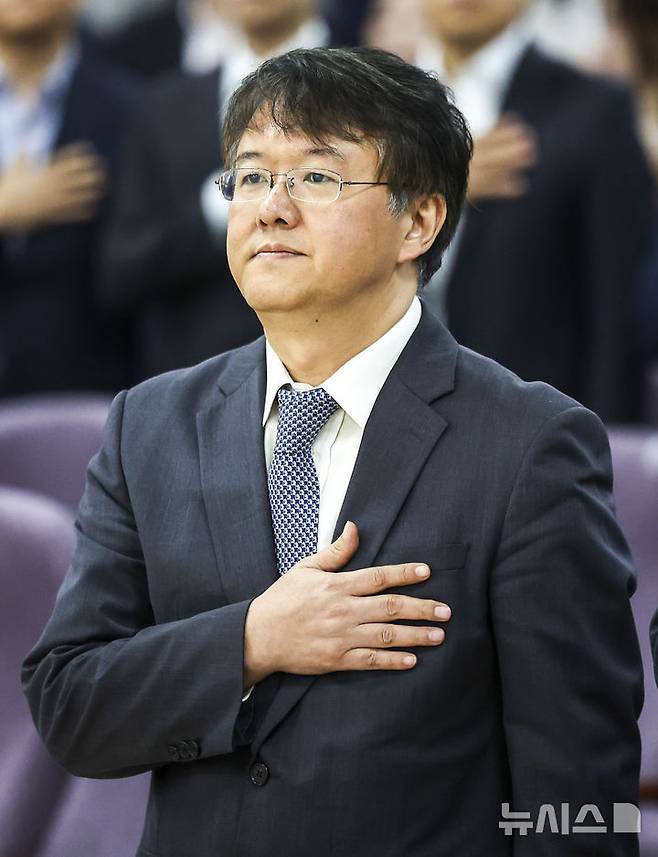 [서울=뉴시스] 김선웅 기자 = 김태훈 신임 서울남부지검장이 4일 서울 양천구 서울남부지방검찰청에서 열린 제24대 검사장 취임식에서 국기에 대한 경례를 하고 있다. 2025.07.04. mangusta@newsis.com