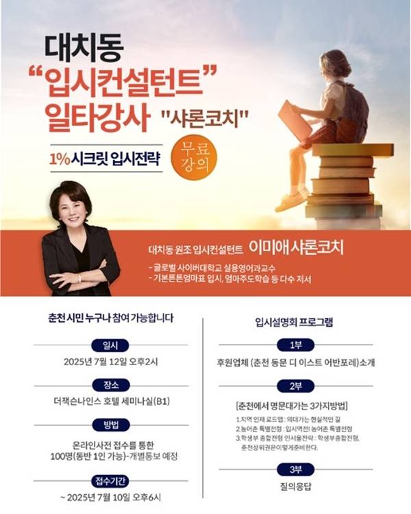 이번 입시설명회에는 강남 대치동의 원조 입시컨설턴트인 ‘사론코치’ 이미애 대표가 직접 연사로 참여한다. 이미애 대표는 대치동 현장에서 수많은 명문대 합격을 이끈 입시 전문가로, △지역 인재 전형 △농어촌 특별전형 △학생부 종합전형 등 다양한 루트를 춘천 교육환경에 맞춰 구체적으로 안내할 예정이다.