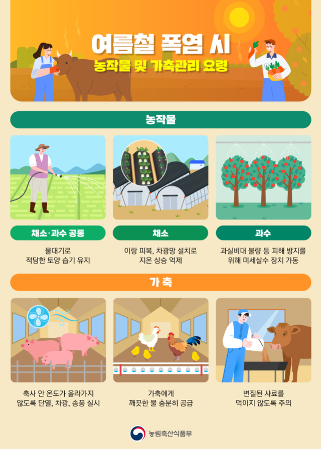 농작물 폭염 피해를 예방하려면 관수량 조절, 시설하우스 차광망 설치 등 기온을 낮출 수 있는 작업이 필요하고 가축 폐사를 막기 위해선 환기·차광·냉방 등의 조치를 해야 한다. 농식품부와 유관기관은 이런 내용을 농가에 알리고 필요한 지원을 적극적으로 추진하고 있다.